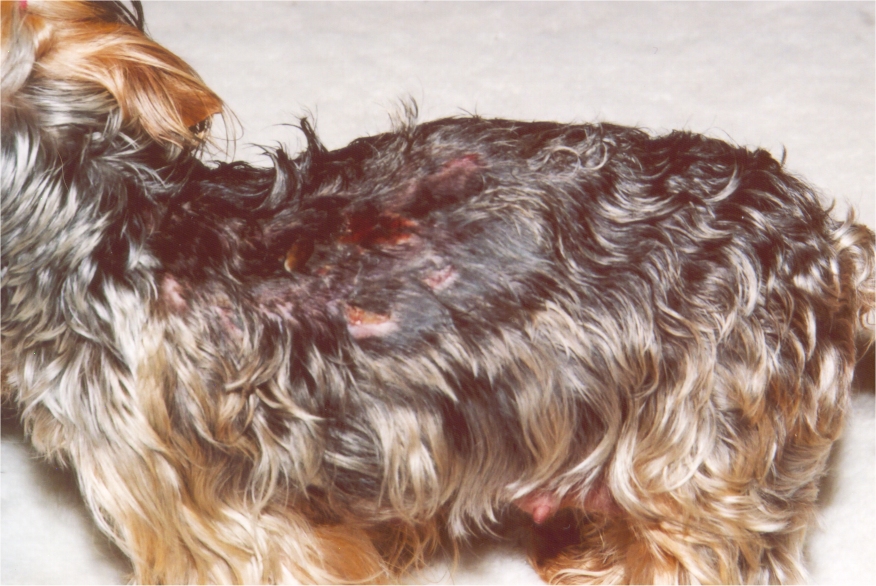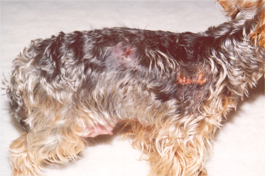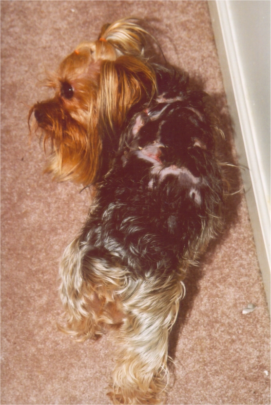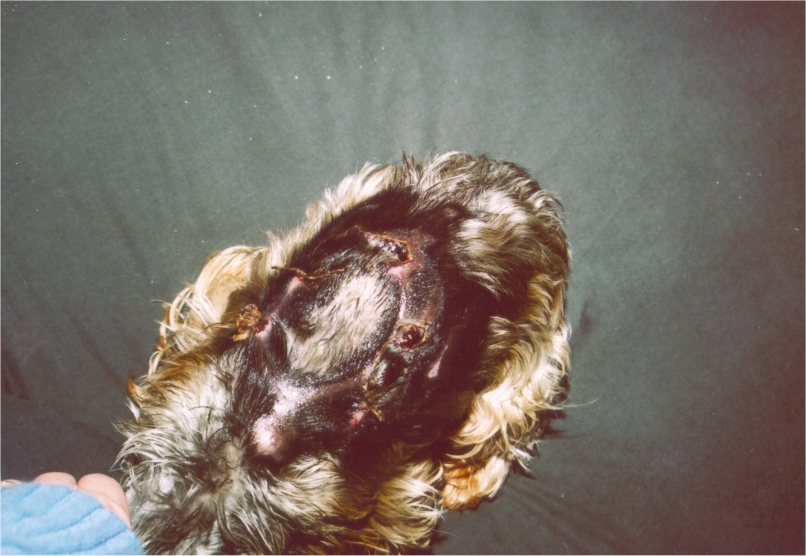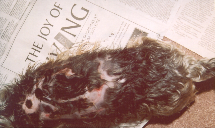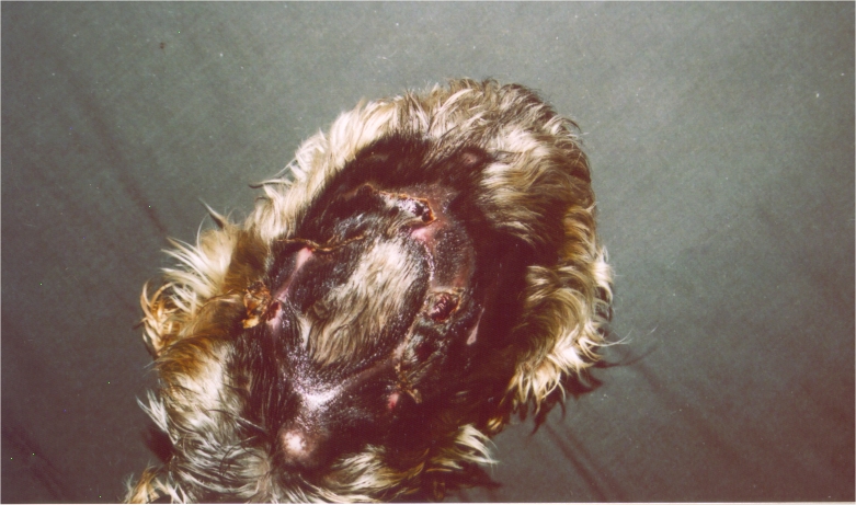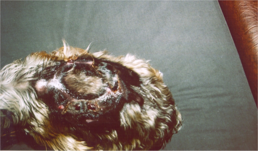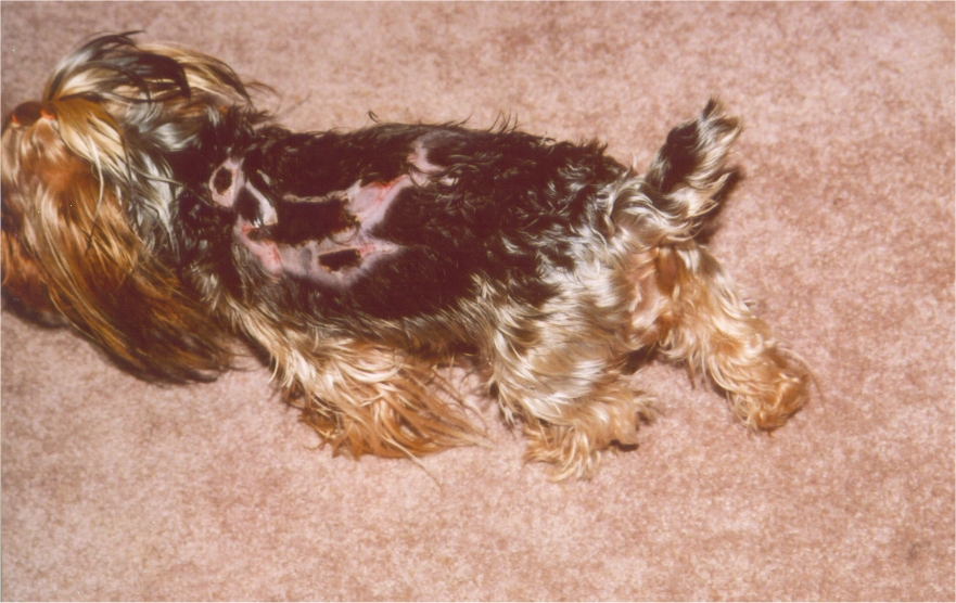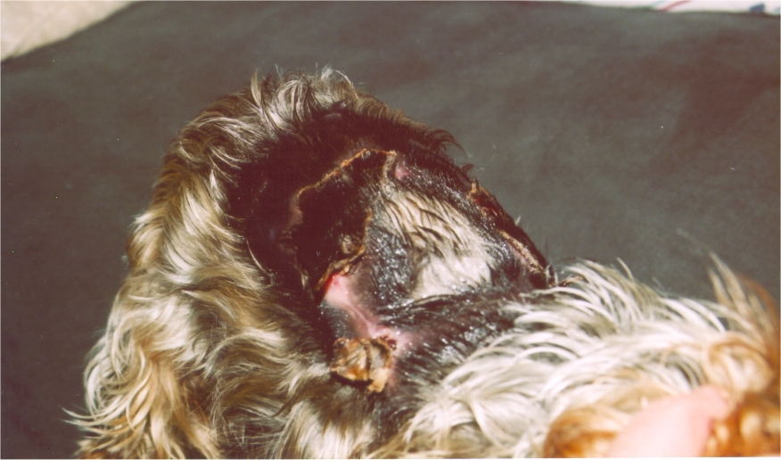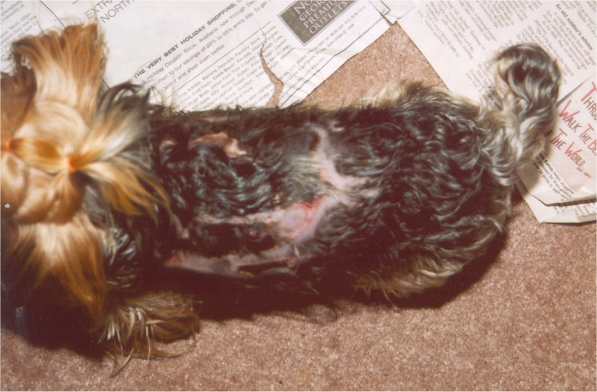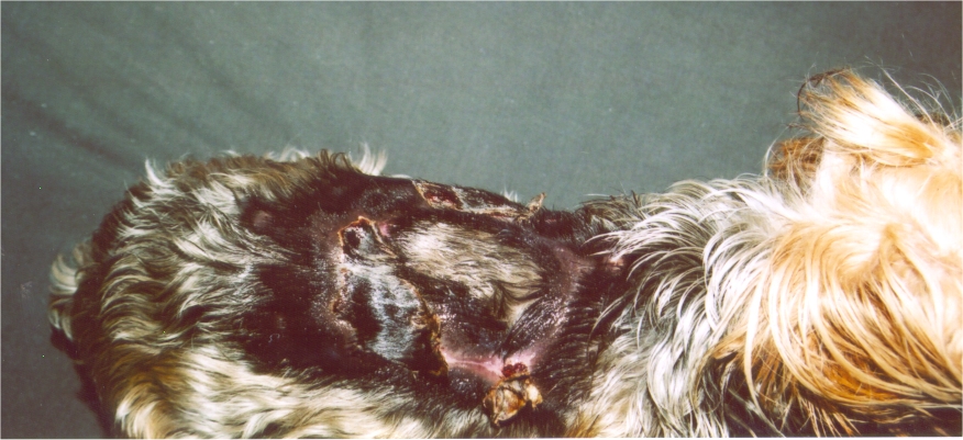 The heating pad was used during a C-Section to deliver puppies. Additional warmth is often helpful because of the reduced body temperature - a result of anesthesia. The initial pictures (2 weeks after the injury) are the first ones where the injury is actually becoming visible, as the skin begins to die and fall away. |